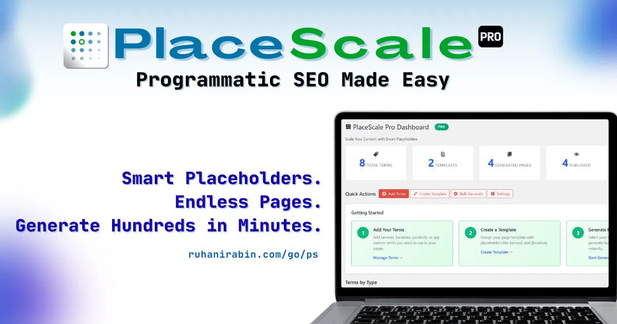 PlaceScale Pro is a programmatic SEO engine for WordPress. You build smart templates with dynamic placeholders (like {service} and {location}), then generate thousands of unique, SEO-optimized pages automatically.